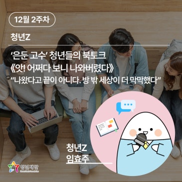 안녕하세요! 청년Z 임효주입니다 2025년 대한민국의 고립·은둔 청년이 약 54만 명(5.2%)에 달한다는 사실, 알고 계셨나요? 2022년 2.4%에서 2배 이상 급증한 수치예요. 그런데 더 충격적인 사실이 있어요. 용기 내어 방 밖으로 나온 청년들 중 60%가 재고립된다는 거죠 왜 이렇게 많은 청년들이 다시 방으로 돌아가는 걸까요? 이 궁금증을 안고 고립은둔 경험 당사자들이 직접 쓴 책 『앗! 어쩌다 보니 나와버렸다』 의 북토크에 참여했어요. 텀블벅 펀딩을 통해 탄생한 이 책의 저자 '쵸'와 '모험가', 두 분의 진솔한 이야기를 들어봤답니다! 고립의 시작: "선택이 아니었다" 북토크는 작가님들의....... ![]()